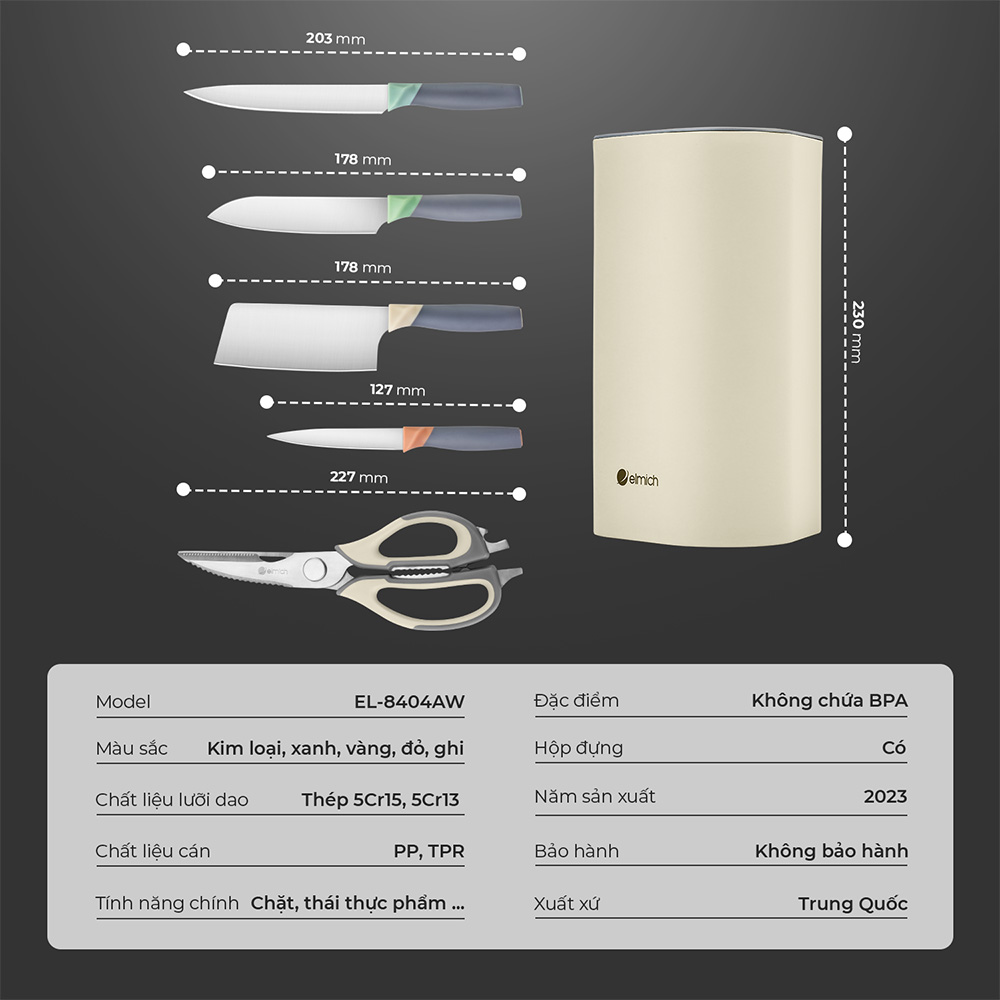 | Kích thước | Hộp đựng dao: 13.4*12.8*23cm Dao chặt gà, 17.8 *0,25cm Dao thái, 17.8*0,25cm Dao thái , 20.3*0.25cm Dao gọt hoa quả, 12.7*0.2cm Kéo nhà bếp, 22.7*7.5cm |