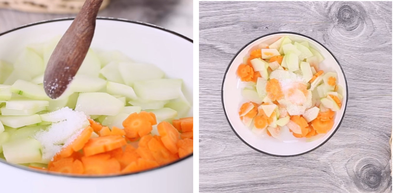 Sau 15 phút, bạn rửa qua với nước để loại bỏ muối, rồi thêm vào bát dưa góp các loại nguyên liệu sau: