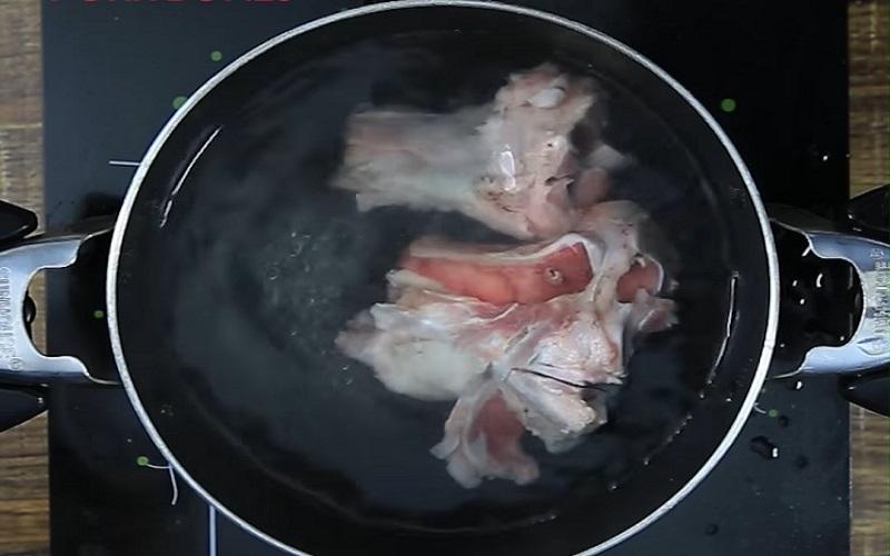 Cho xương vào nồi lớn, bắc nồi lên bếp với nước để ninh cho nhừ. Ninh khoảng 2 tiếng để xương ra hoàn toàn chất ngọt là được.