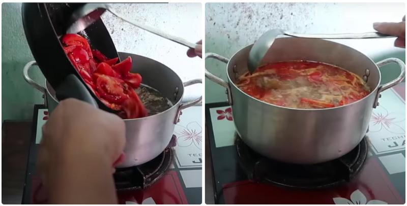 Chút phần cà chua đã xào mềm vào trong nồi nước dùng