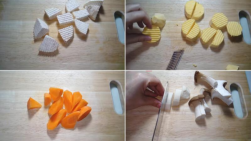 Các loại củ đã chuẩn bị bạn nạo sạch vỏ, rửa sạch sau đó cắt thành từng miếng dài vừa ăn. Hành tây lột bỏ vỏ, thái thành những múi cau. Nấm đùi gà bóc vỏ sạch, sau đó cắt thành những miếng nhỏ.