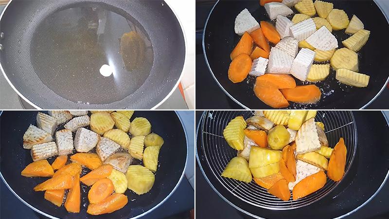 Các loại củ sau khi rửa sạch bạn đem để riêng vào rổ cho ráo nước hoàn toàn. Sau đó , bạn bắc chảo lên bếp với 4 thìa canh dầu ăn. Khi dầu nóng, bạn cho khoai lang, khoai môn và cà rốt vào nồi để chiên sơ với lửa vừa đến khi 2 mặt vàng đều thì vớt ra.