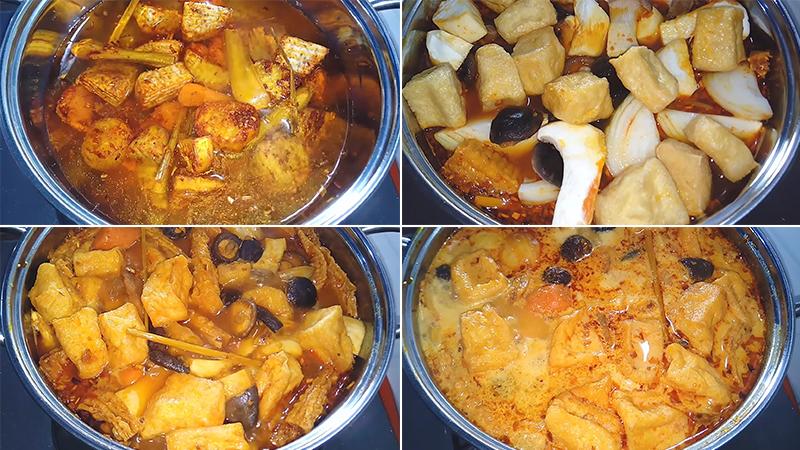 Khi bạn thấy nồi cari sôi lại, hạ lửa và nấu liu riu khoảng 5 phút nữa. Để cho các loại củ chín mềm. Sau đó cho tàu hũ ky cả cọng vào trong nồi, cùng với nấm đông cô, nấm đùi gà, đậu hũ chiên, hành tây. Tiếp tục nấu sôi với mức lửa nhỏ, giữ nồi hầm trong khoảng 10 phút nữa là được.