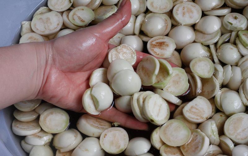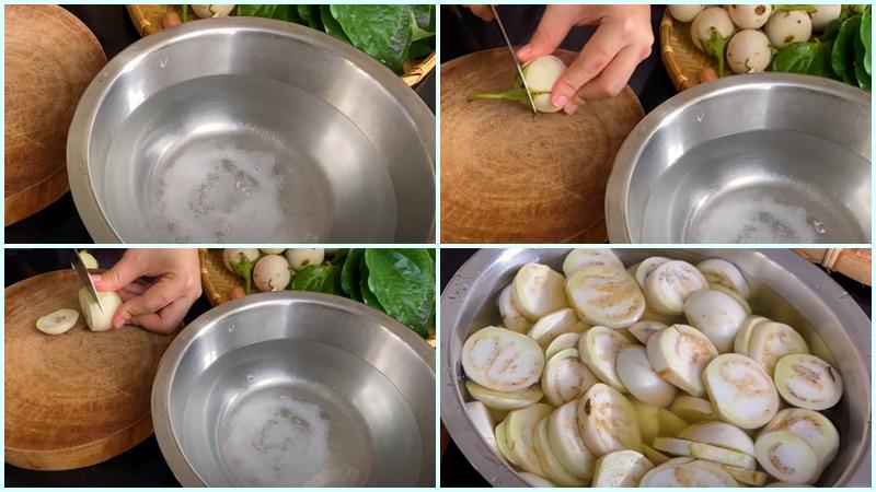 Sau đó bạn cắt bỏ phần cuống đầu của quả cà. Cắt thành từng lát dày cỡ 0,3cm. Thái đến đâu bạn nhanh tay thả cà vào thau nước muối đã chuẩn bị để tránh cho cà bị đen nhé. Chỉ cần để ngoài chưa đến 1 phút là đủ để cà bị nhựa bám đen, khi ăn rất chát.