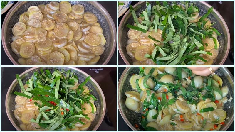 Lần lượt thêm gia vị, cho các loại rau vào để hoàn thành cà xào lá lốt nhé