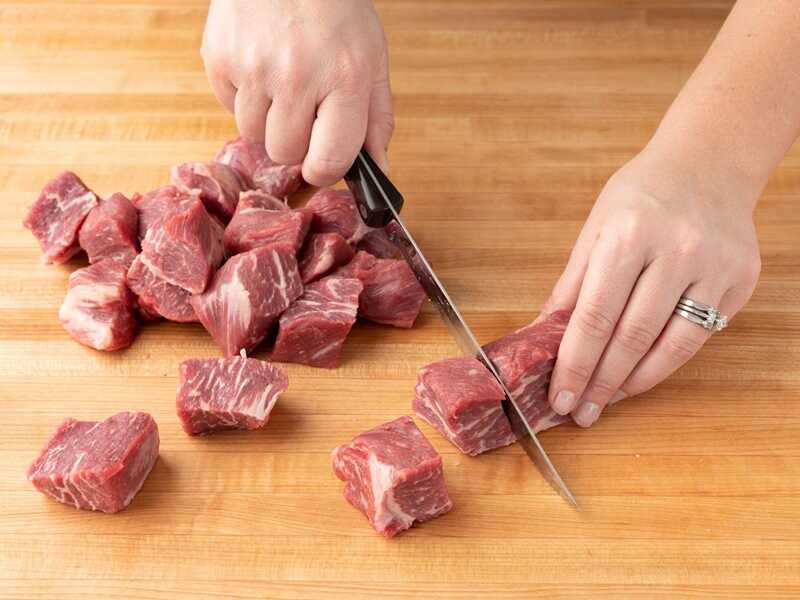 Cắt thịt bò thành từng miếng vuông vừa ăn
