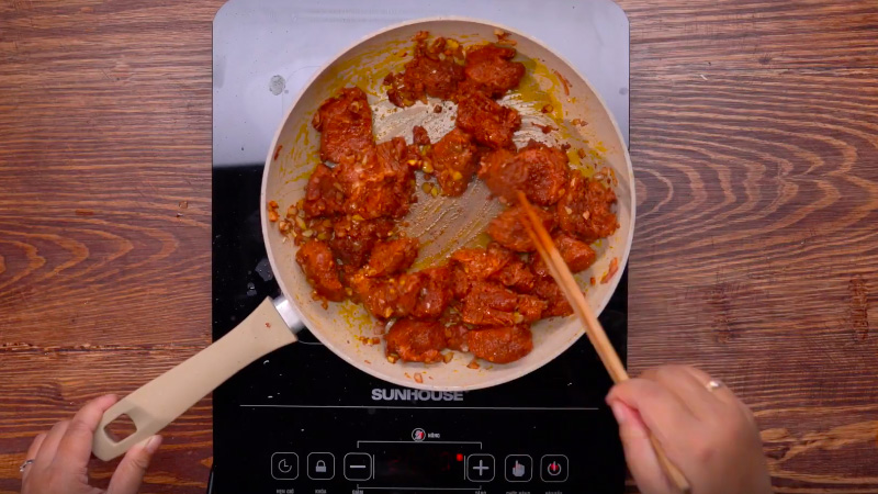 Tiếp theo, cho phần sả, gừng và hành tím còn lại đã được băm nhuyễn vào nồi và phi thơm. Rồi tiến hành cho thịt bò vào xào ở lửa vừa đến khi thịt săn lại. Đổ khoảng 1.5 lit nước dừa tươi và hành tây vào nồi để hầm khoảng 35 - 40 phút.
