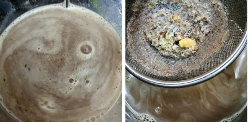 Bật máy xay ở mức vừa sau đó xay trong vòng 3 phút. Sau khi xay, bạn đặt rây lên bát, lót lên rây một tấm vải xô mỏng và lọc nước xay xương cá.
