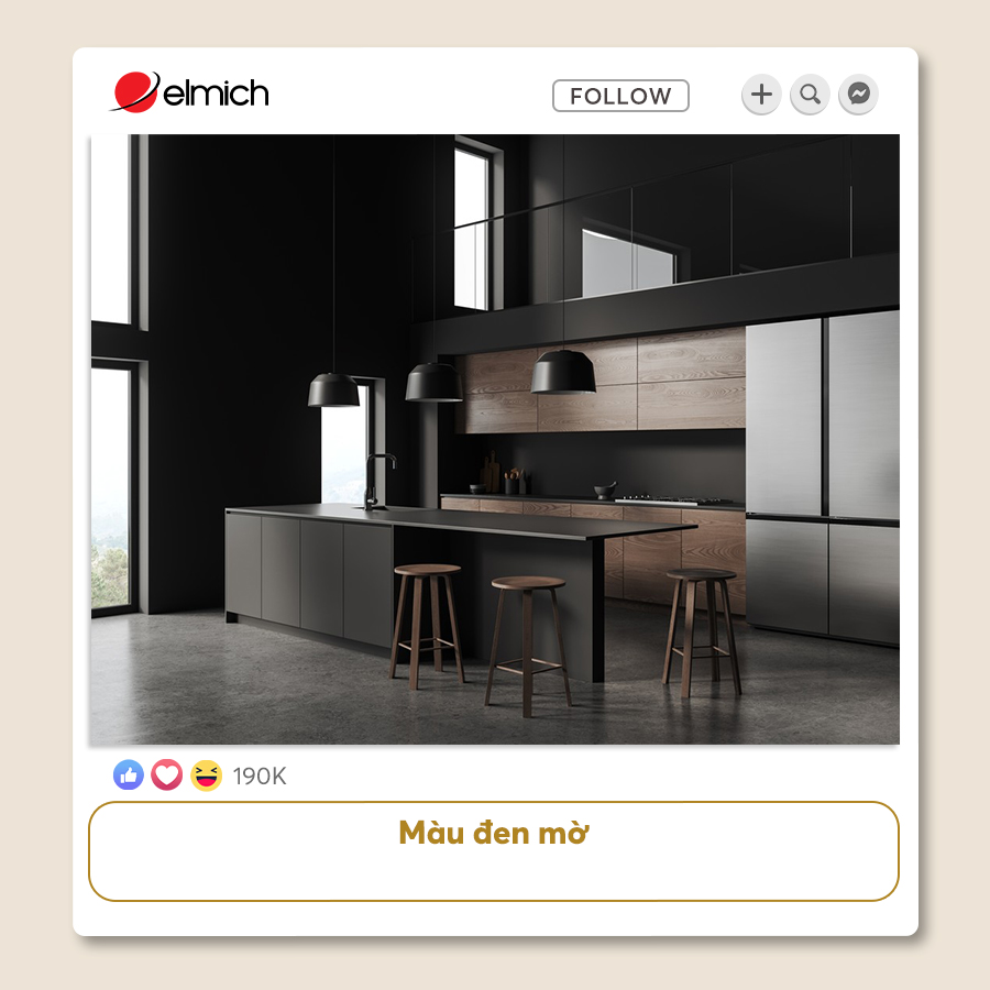 Màu đen mờ: Sử dụng màu đen mờ cho tủ bếp hoặc thiết bị gia dụng tạo nên vẻ sang trọng và hiện đại, đặc biệt khi kết hợp với các chi tiết kim loại màu vàng.