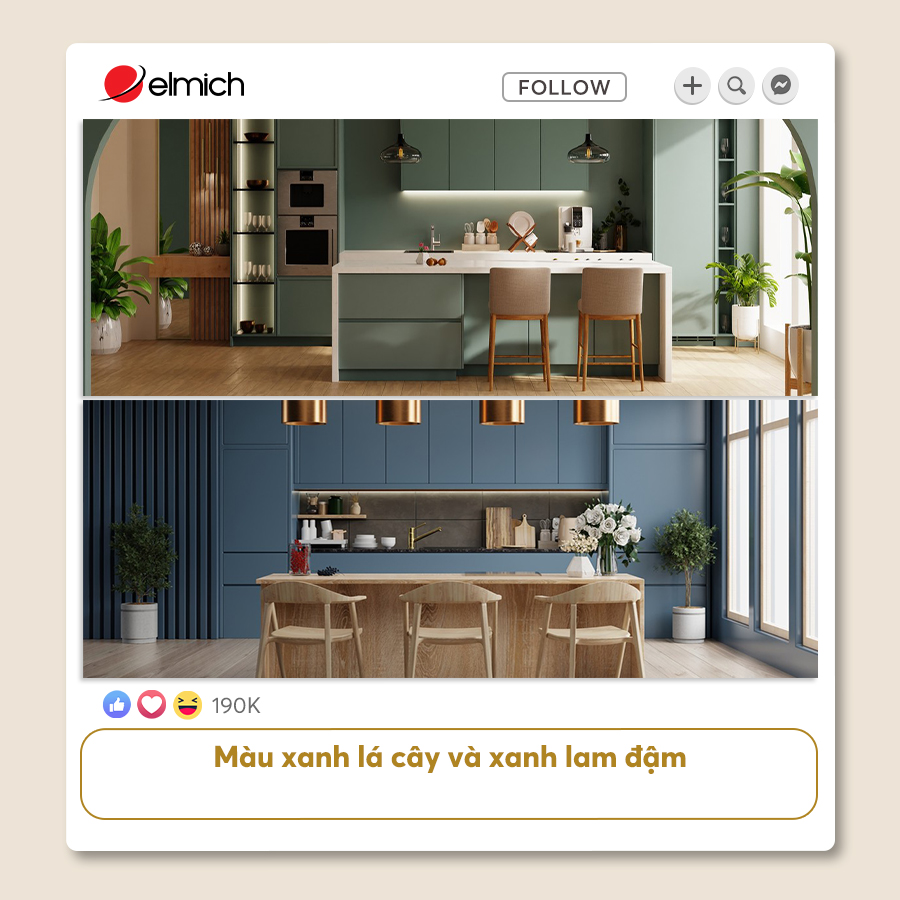 Màu xanh lá cây và xanh lam đậm: Những gam màu này tiếp tục được ưa chuộng, mang lại sự tươi mới và thanh lịch cho không gian bếp.