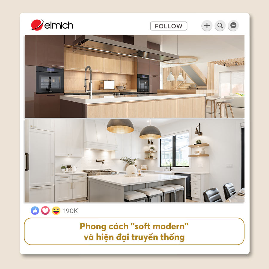 Phong cách "soft modern" và hiện đại truyền thống: Sự kết hợp giữa các yếu tố hiện đại và truyền thống, tạo nên không gian bếp tinh tế và linh hoạt.