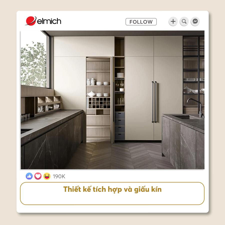 Thiết kế tích hợp và giấu kín: Các thiết bị gia dụng được tích hợp hoặc giấu kín giúp không gian bếp trở nên gọn gàng và tối giản hơn.